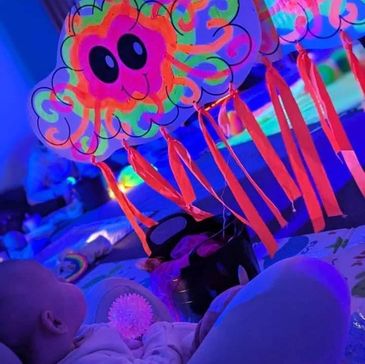 Rainbow lighting creates different moods and helps babies to focus on the toys and neon moving objects. We don't just use children's music - we use music and songs from all genres including pop, classical and instrumental sequences.